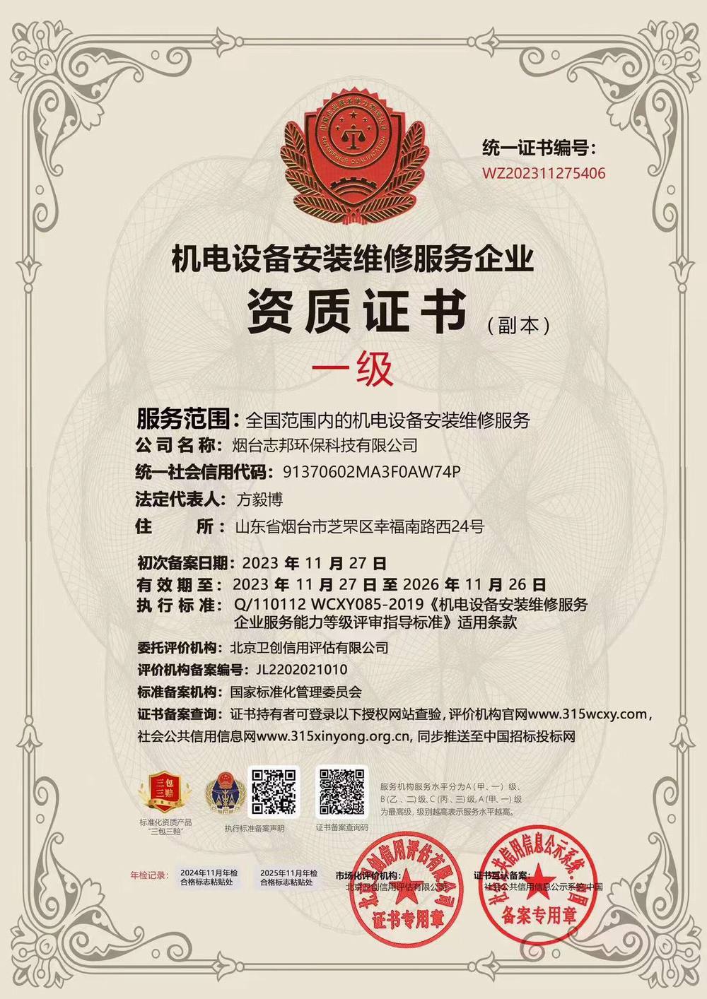 環保工程(施工、設計、安裝、運維)服務企業資質證書